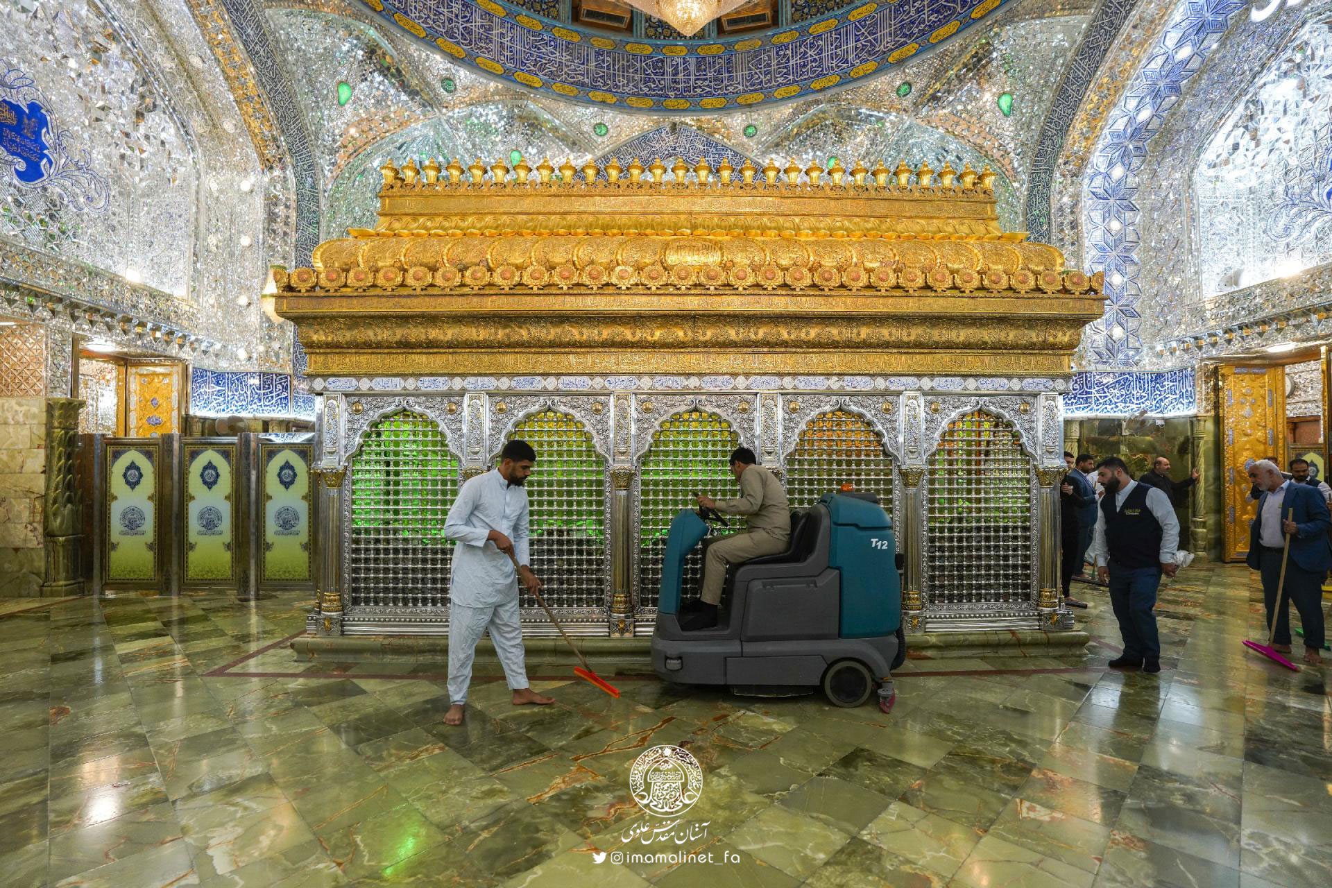 شستوشو و نظافت رواقهای ضریح مطهر علوی به مناسبت حلول ماه ربیعالاول توسط خادمان آستان مقدس علوی