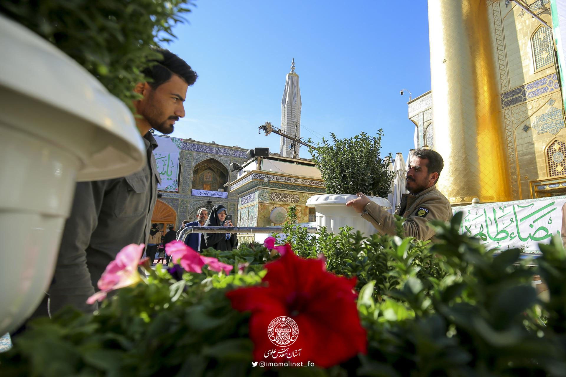 آذین‌بندی صحن و سرای علوی با انواع گل‌ها به مناسبت سیزده رجب