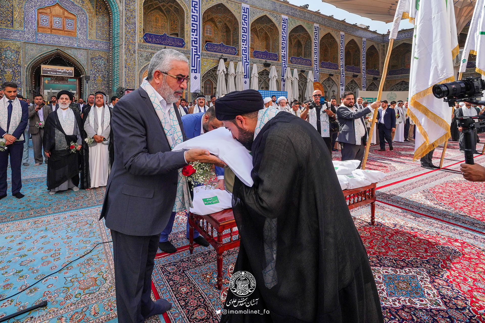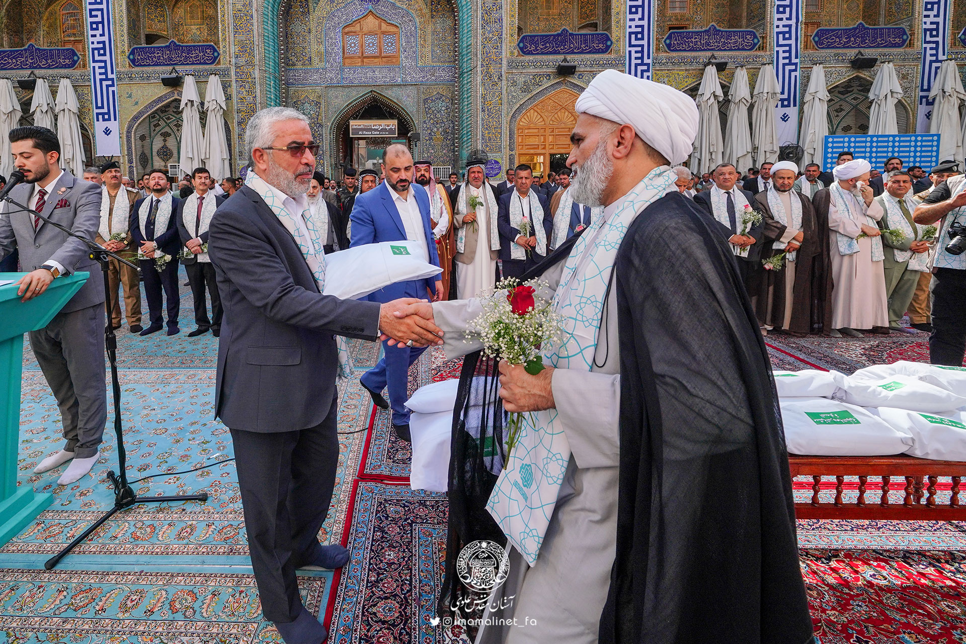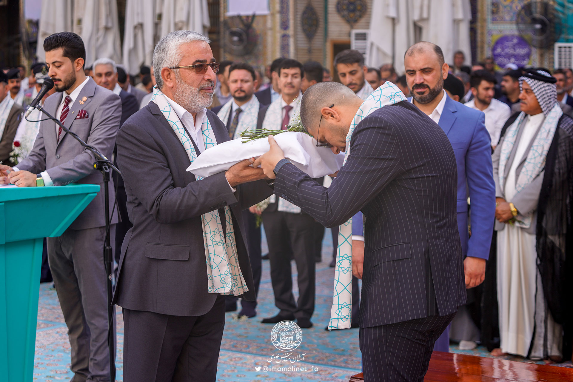 «سیدعیسی خرسان»، تولیت آستان مقدس علوی پرچمهای غدیر را تحویل نمایندگان مؤسسات و نهادهای دولتی و جامعه مدنی استانهای مختلف عراق داد تا به مناسبت عید غدیر به اهتزاز درآیند.