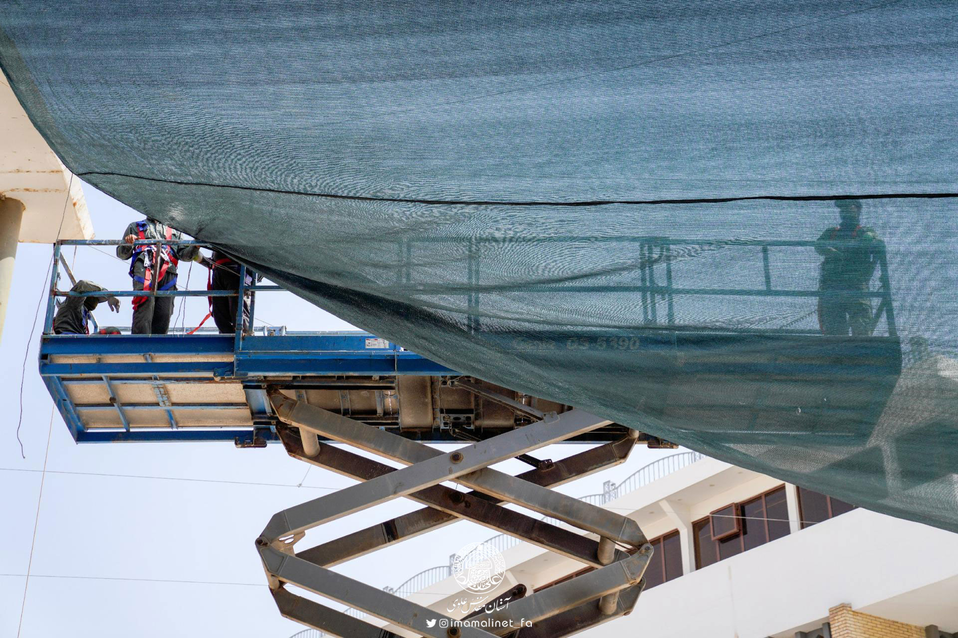 نصب سایبان در محوطه شبستان حضرت فاطمه زهرا سلام‌الله‌علیها