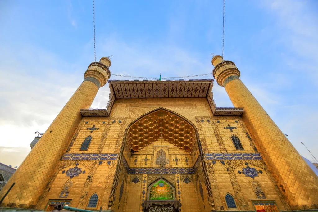 در طرفین دیوارۀ بیرونی ایوان طلا که به گلدسته‌ها می‌رسد، دو کتیبۀ میناکاری بزرگ قرار دارد که در آن دو بیت از هفت بند کاشی متعلق به «ملا حسن کاشی» عالم و شاعر دربار سلطان محمد خدابنده است مشهور است که او این شعر را در منقبت امیرالمومنین (علیه‌السلام) گفته و از او صله دریافت کرده است.