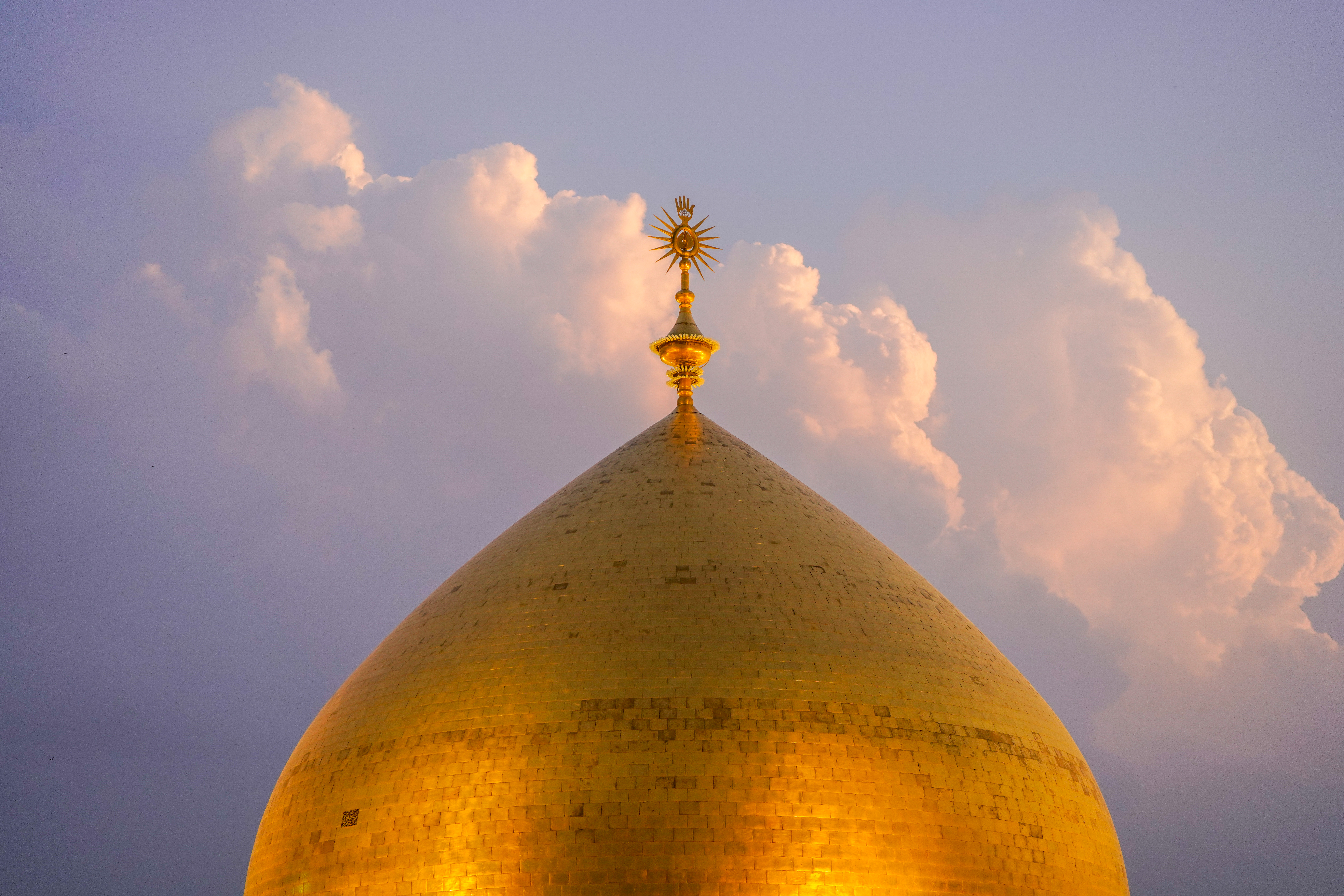 تصویر کامل گنبد حرم امام علی امیرالمؤمنین و ابرهای پشت آن در طلوع